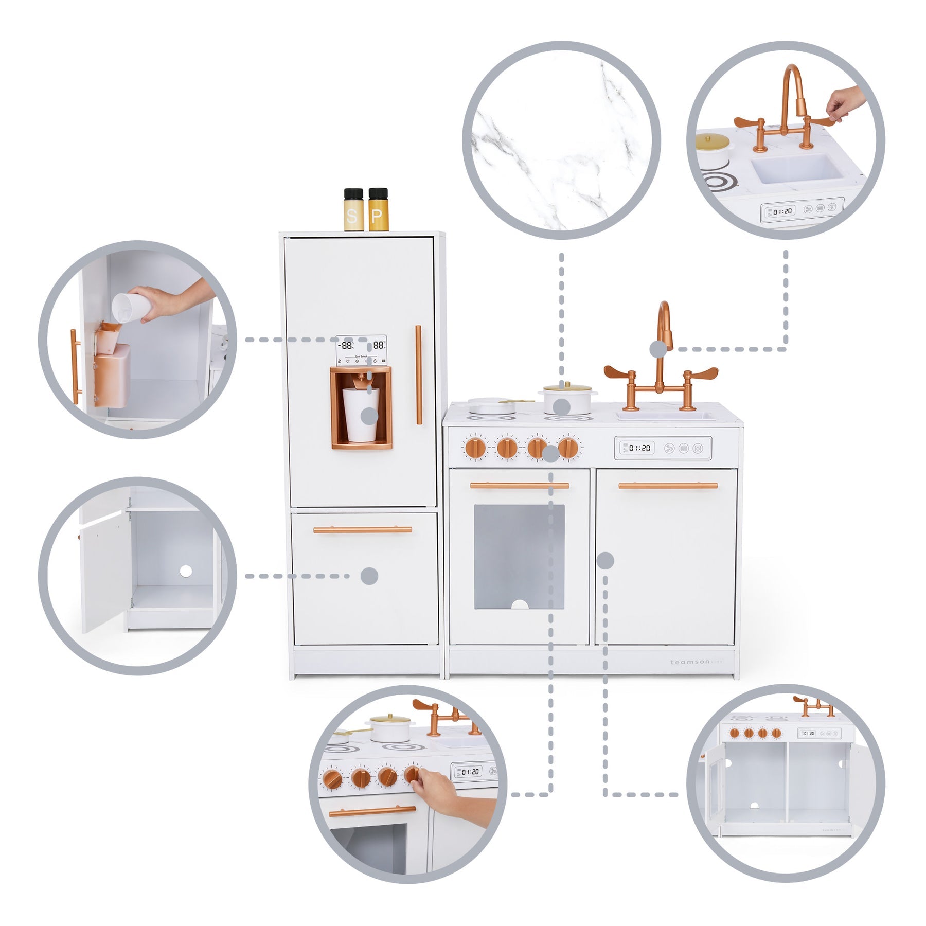 - JUST AS STYLISH AS A GROWN-UP KITCHEN: Styled after today’s glamorous grown-up décor, this fabulous Little Chef Milano Play Kitchen is simply gorgeous. The faux white marble finish on the two-way countertop and chic rose gold “hardware” will have you begging for your OWN kitchen refresh!